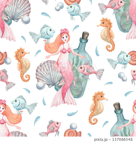 Watercolor pattern featuring a mermaid sea creatures and treasures