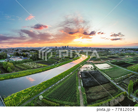 空撮「埼玉県」自然豊かな見沼田んぼと美しい夕景