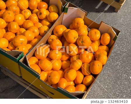 Fresh oranges in cardboard boxes at market. Seasonal fruit, natural abundance, and healthy vitamin source in everyday life.