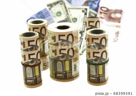currency of different denominations in rolls and in bulk on a white background