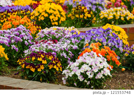 鮮やかな色とりどりのパンジーが咲き誇る花壇