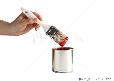 PNG, Paint, hand with paintbrush and can of red paint, isolated on white background
