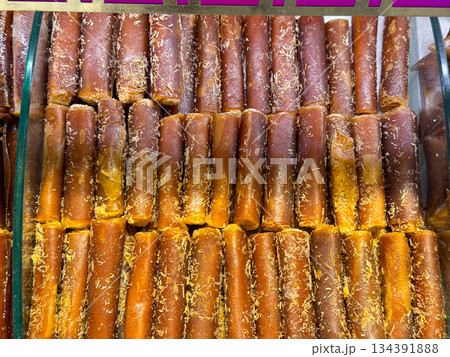 Rolled fruit leather sheets aligned in rows inside a market display case in Istanbul bazaar. Traditional preservation methods, natural sweetness, and simple ingredients reflecting culinary heritage