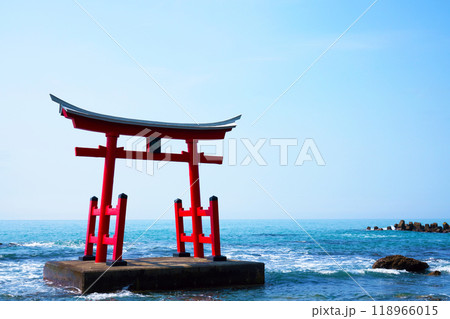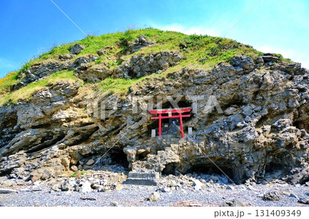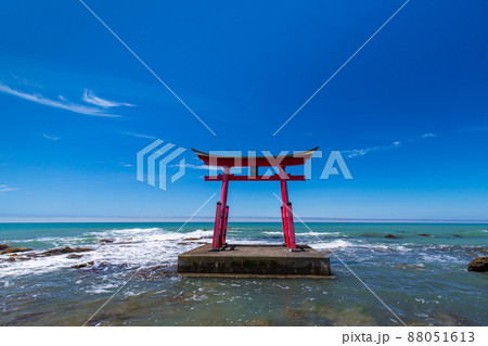 日本海に佇む北海道初山別村の金比羅神社の鳥居