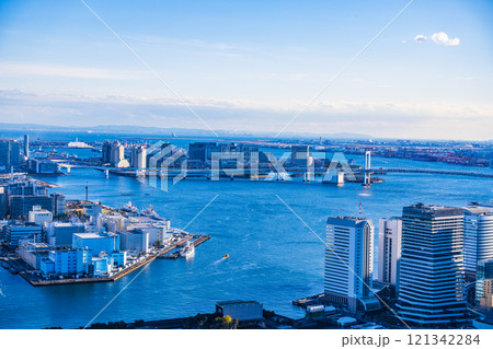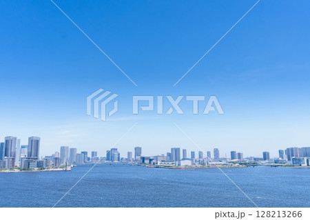 青空と青い海の間にビルと橋がある東京湾岸の景色