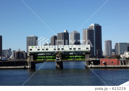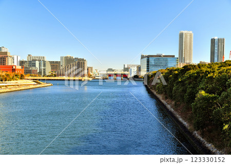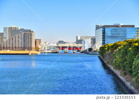 日本の東京都市景観 相生橋から豊洲水門や豊洲、屋形船(新浪)などを望む