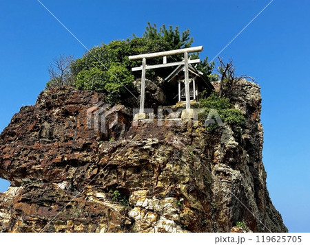 《稲佐の浜 弁天島の鳥居と豊玉毘古命(とよたまひこのみこと)を祀る(まつる)祠(ほこら)》(島根県)