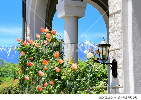 美術館のアーチの壁に咲くバラの花と北アルプス