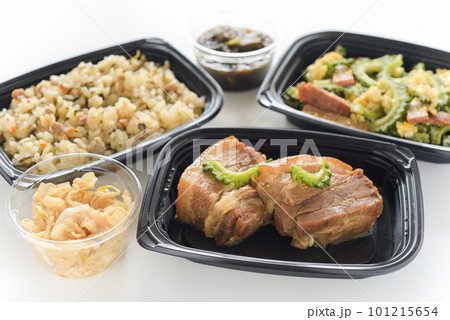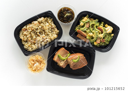 沖縄料理のテイクアウト容器に入ったお弁当 縦位置