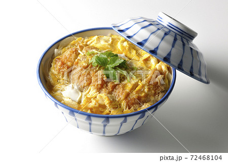 丼ぶりに入った熱々カツ丼を白背景で単品撮影
