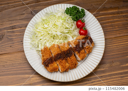 白い皿にソースのかかった豚カツと千切りキャベツの俯瞰