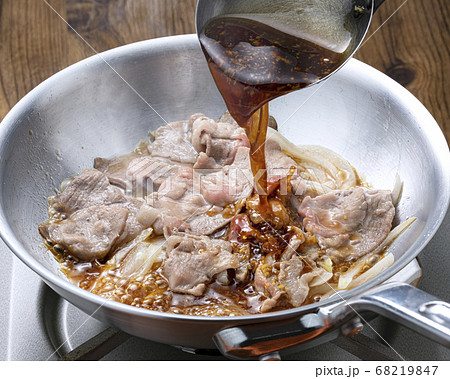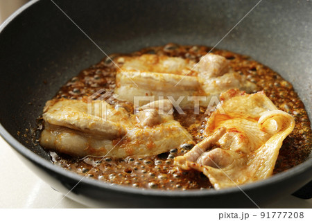 フライパンで調理している豚の生姜焼き