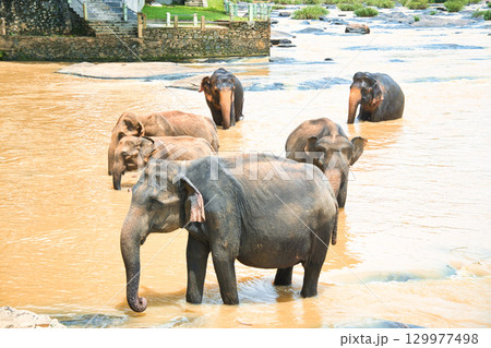 スリランカのピンナワラのゾウの孤児園の象が集団で川遊びをしている