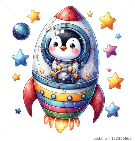A cute penguin character piloting a colorful rocket in space. watercolor clipart cartoon