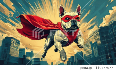 French Bulldog flying through city, in a red cape and mask. Comic book style, pop art retro poster