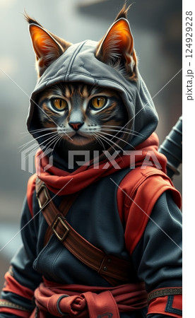 illustration portrait of a cat with a ninja costume and katana swords representing a fearsome assassin