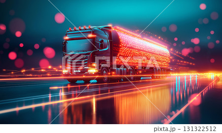 Red truck with illuminated trailer driving on highway at night
