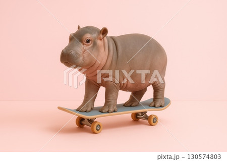 Cute Baby Hippopotamus Skating in Minimalist Pastel Room Humorous Wildlife Fusion Surreal Sports Concept