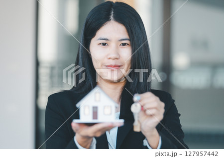Female Real Estate Broker presenting and advised to model home and building project detail in the office, sign purchase sales contract, agreements concerned mortgage loan offer and insurance.