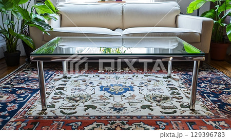 Glass coffee table sits in front of a white couch