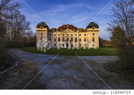 Aerial view of illuminated Lednice Palace, Czech Republic
