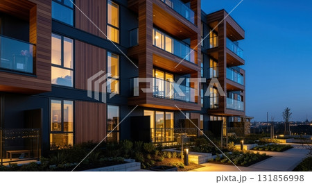 Modern residential building with illuminated windows, wood facade, and glass balconies at twilight
