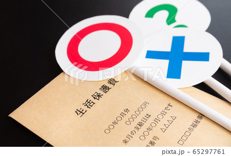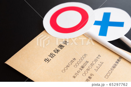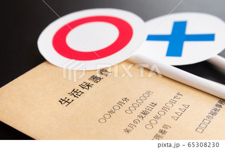 生活保護イメージ 生活保護費と丸バツ 社会問題とセーフティーネット 生活保護の審査
