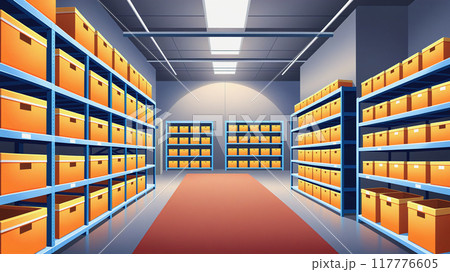 「蒼き倉庫の戦場に立ち尽くす巨大なボックス群れ」