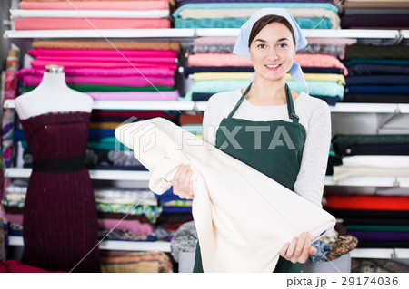 Young female seller of sewing supplies shop showing colored threads for dressmaking