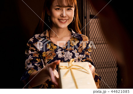 女の子座りでプレゼントを持つ女性 主体左口あり右向き