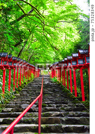 新緑の貴船神社 朱色の灯篭と石段