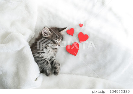 Adorable tabby kitten sleeps peacefully on soft white blanket beside three red hearts, symbolizing love and warmth
