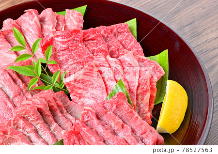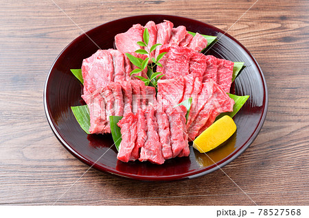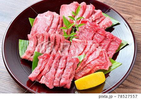 国産交雑牛の牛肉希少部位の焼肉用の生肉。シンシン、イチボ、ザブトン、ミスジ。(部位名は正しいか不明)