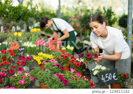 Positive young woman choosing potted Petunia flowers for house while shopping in greenhouse