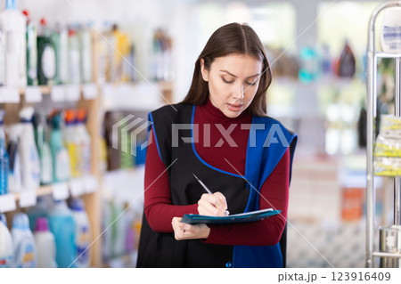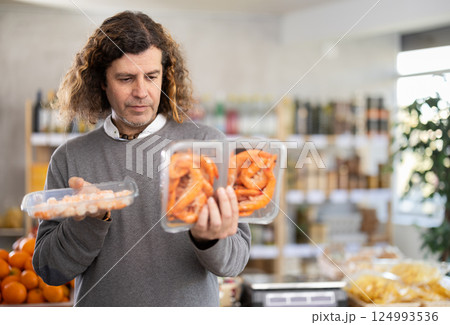 Young female customer carefully choosing can of green peas in grocery supermarket