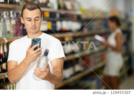 Man using smartphones to scan barcodes on bottles of alcoholic beverages