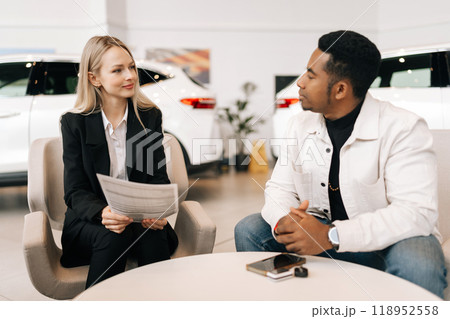 Portrait of female car dealer consulting black buyer, handing over purchase agreement for review at showroom. Serious African client receiving car purchase contract before signing in dealership