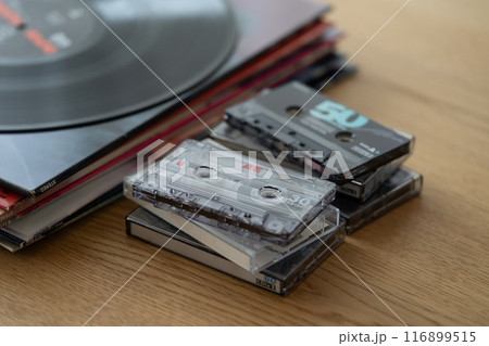 積み上げたレコードジャケットとLPレコードとカセットテープ
