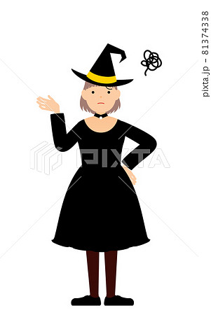 ハロウィンの仮装、魔女姿の女の子が腰に手を当てて困っているポーズ