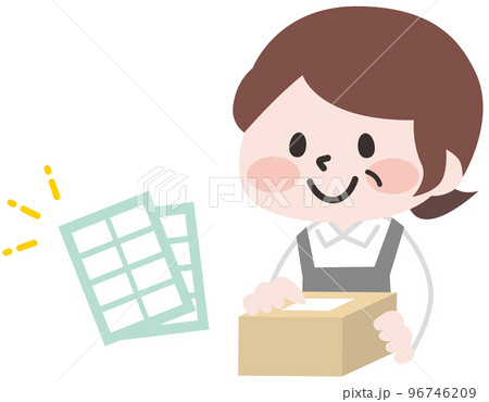 シール貼りをする女性