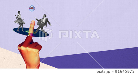 Contemporary art collage. Creative design. Cheerful stylish couple dancing on CD disc, having party, celebration. Flyer