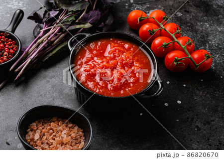 Tomato puree, on black dark stone table background