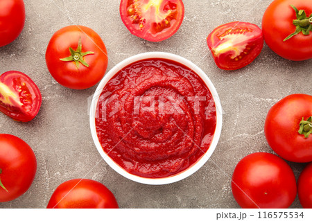 Tomato ketchup sauce in a bowl with tomatoes on grey concrete background.