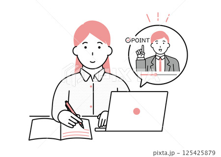 オンラインで資格所得やスキルアップなどのために勉強をする若い女性のイラスト