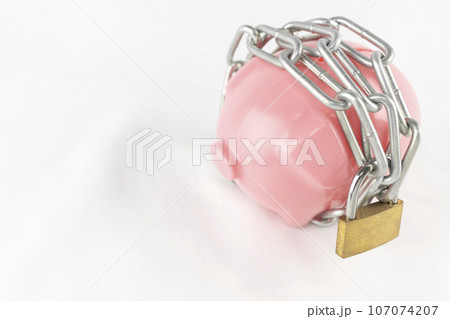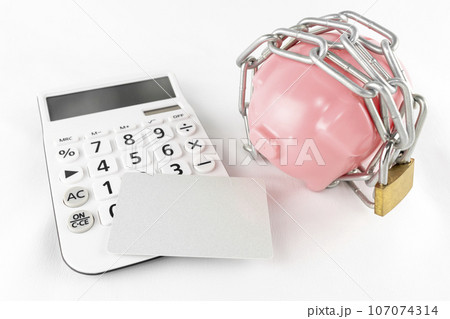 豚の貯金箱と鎖と電卓とカード。お金を守るイメージ