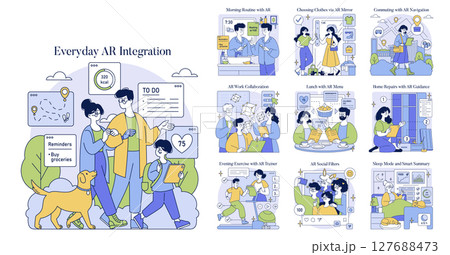 Vector illustration depicting augmented reality integration in daily activities, including morning routines, clothing selection, commuting, work collaboration, and home repairs. People use AR for