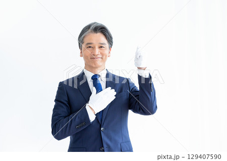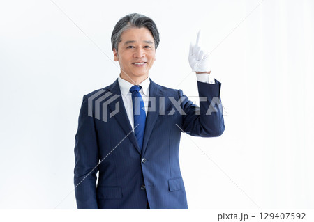 買取業者 鑑定士 白手袋をして電卓を持っている男性