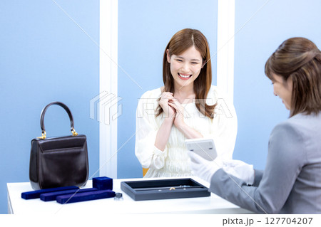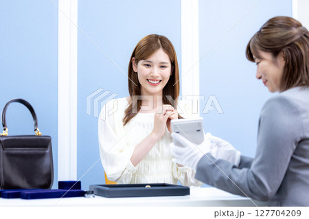 買取業者 バックと貴金属の査定をしてもらっている女性