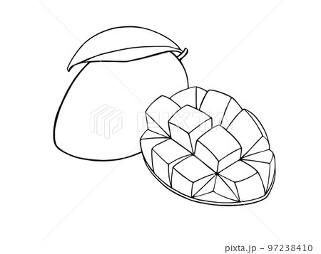 マンゴー(賽の目状にカットしたものと丸のまま)のシンプルな線画イラスト