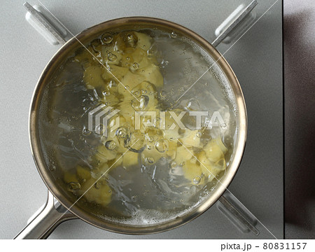 角切りしたジャガイモを茹でる 俯瞰撮影